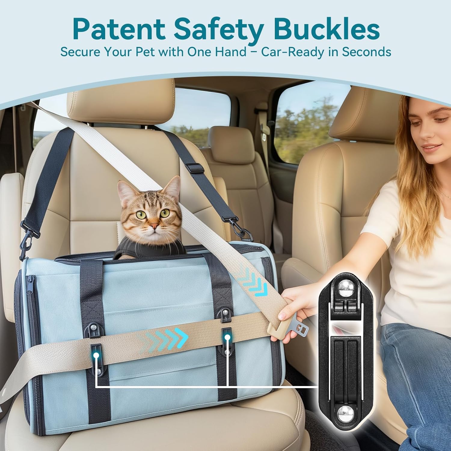 Featuring patented buckles and an adjustable clip-on harness, this cat car carrier ensures stability during car travel. It also includes an anti-loss safety rope and a lockable zipper to prevent pets from jumping out and distracting the driver.