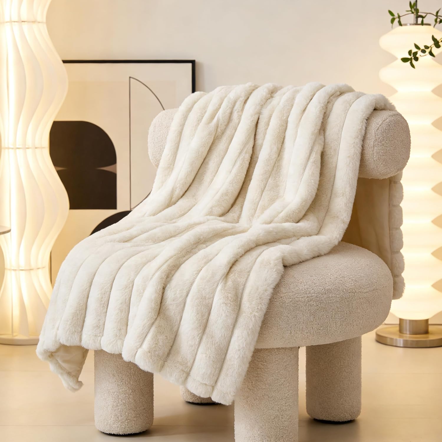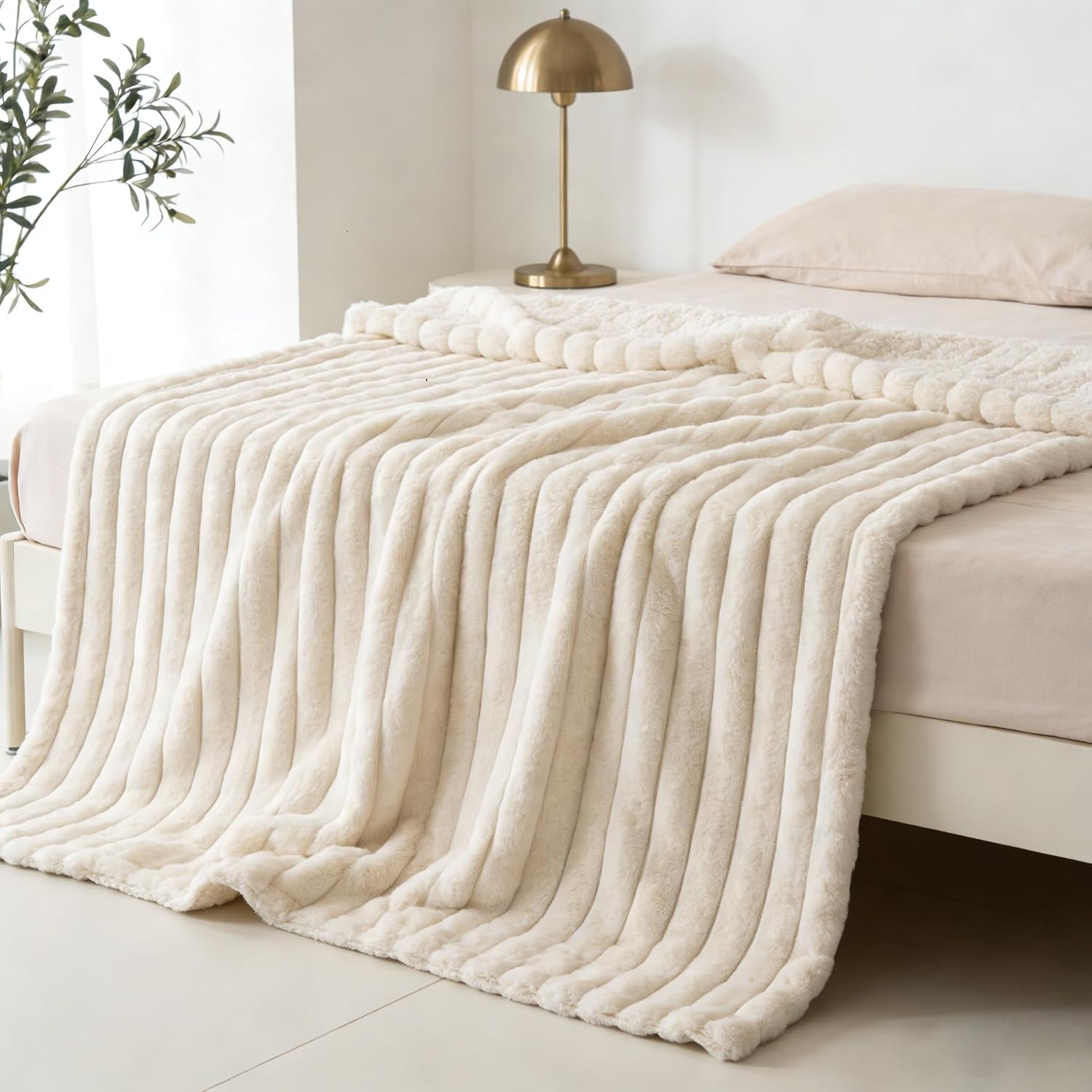 Dog blanket lined with stripe rabbit faux fur on one side and soft mink plush on the other, which offers the utmost comfort all year round. Keeping your dogs, cats, kids and even yourself in stylish warmth.